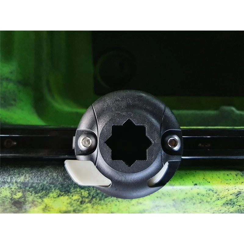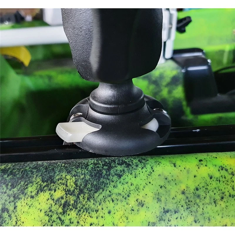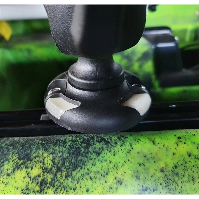 Neigung und Richtung des Angelrutenhalters können dank Kugelgelenk individuell eingestellt werden. Nach Monatge am Kajak kann die gesamte Konstuktion, auch mit Angel, in der Schiene vor und zurück bewegt werden. Die Angelrutenaufnahme der Halterung kann mit einem Drehverschluss geschlossen und die Angel so gesichert werden.